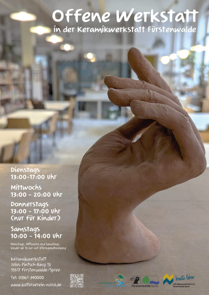 Jeden Donnerstag zwischen 13 Uhr und 17 Uhr könnt ihr kostenlos und ohne Anmeldung zu uns in die Keramikwerkstatt kommen. Lasst uns gemeinsam das Material entdecken und schauen, was man alles mit Ton machen kann. Wir freuen uns auf euch! Für Kinder ab 7 Jahren. Falls es Fragen gibt, meldet euch gerne unter anke.schuettler@kulturverein-nord.de oder 03361-340000