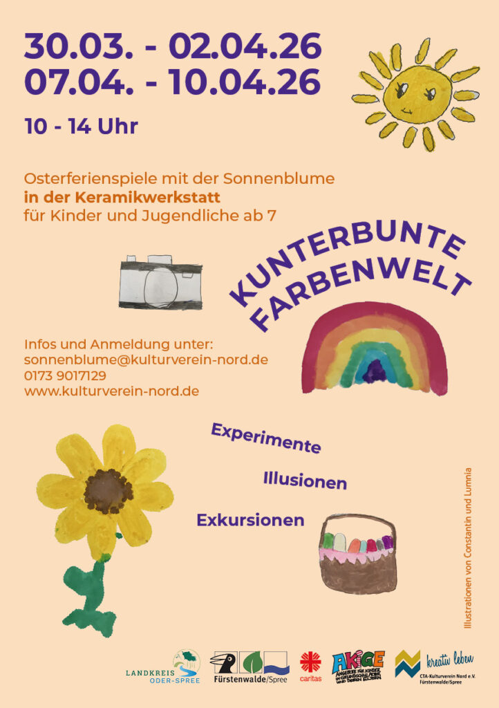 Was ist so besonders an Farben? Wo finden wir Farben? Wofür sind Farben wichtig?Lasst uns gemeinsam experimentieren und neue Dinge entdecken. Wir wollen mit euch in eine kunterbunte Welt eintauchen und herausfinden, was wir alles mit Farben anstellen können. Osterferienspiele mit der Sonnenblume in der Keramikwerkstatt für Kinder und Jugendliche ab 7Teilnahme pro Kind 5 Euro die Woche, Mittagessen inklusive! Infos und Anmeldung unter:sonnenblume@kulturverein-nord.de0173 9017129 Achtung: in diesen Ferien treffen wir uns in der Keramikwerkstatt!Keramikwerkstatt Fürstenwalde, Julius-Pintsch-Ring 13, 15517 Fürstenwalde